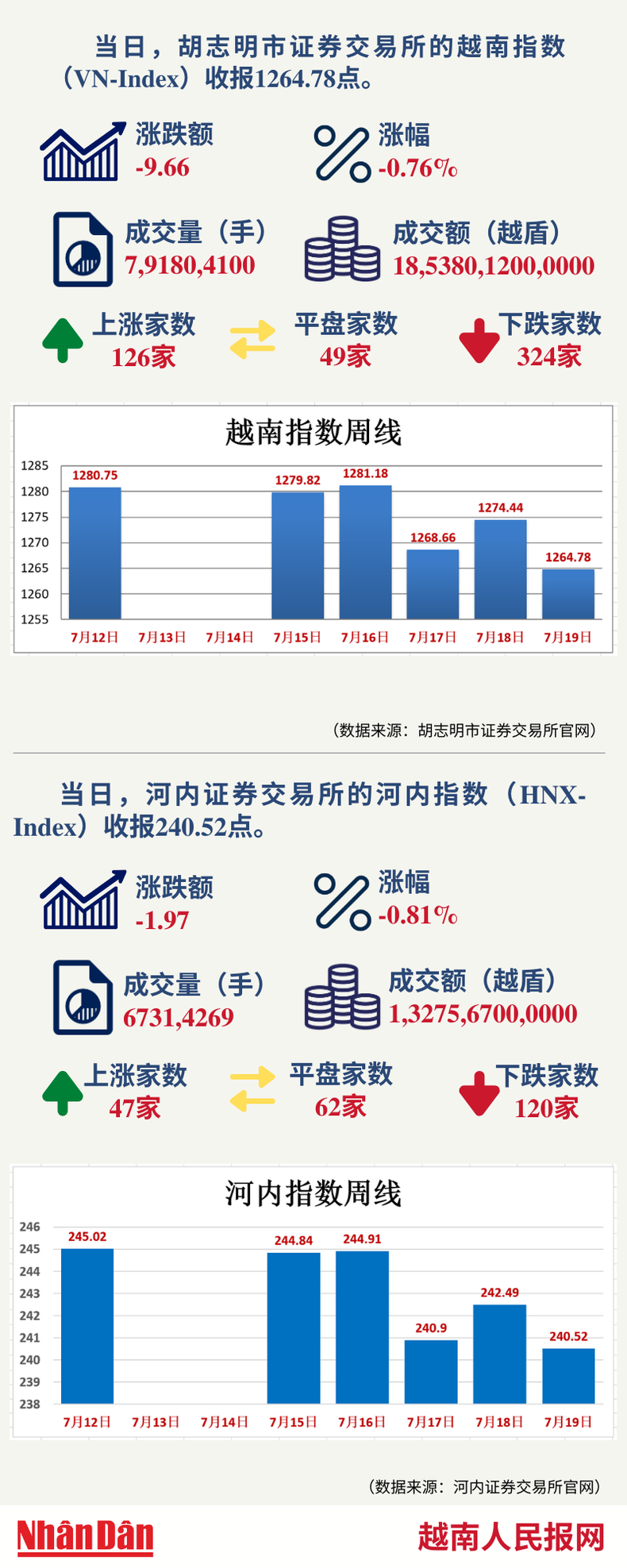 当天,胡志明市证券交易所的越南指数(VN-Index)和河内证券交易所的河内指数(HNX-Index)分别收报1264.78和240.52点。