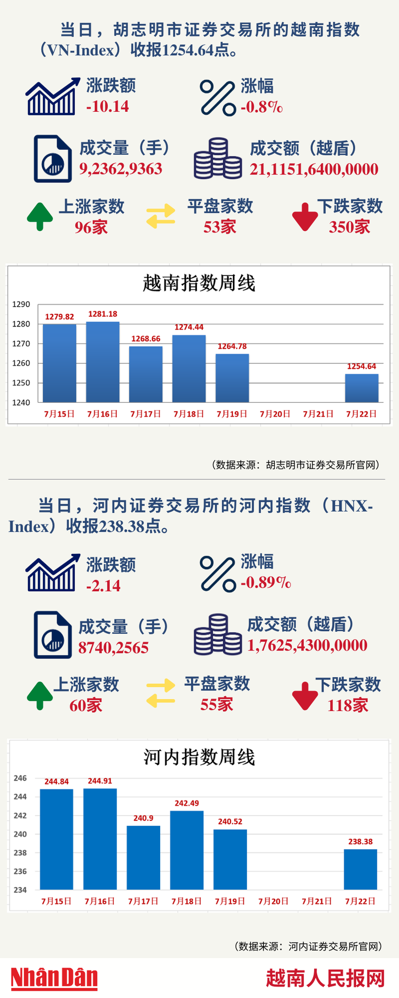 当天,胡志明市证券交易所的越南指数(VN-Index)和河内证券交易所的河内指数(HNX-Index)分别收报1254.64和238.38点。