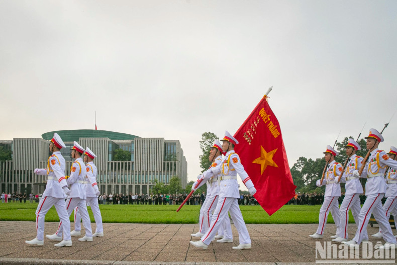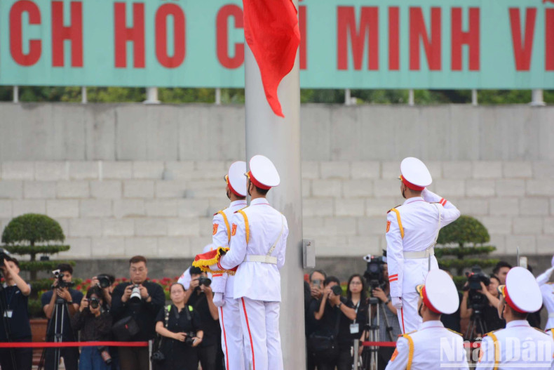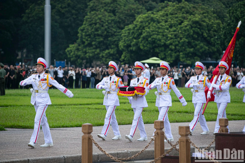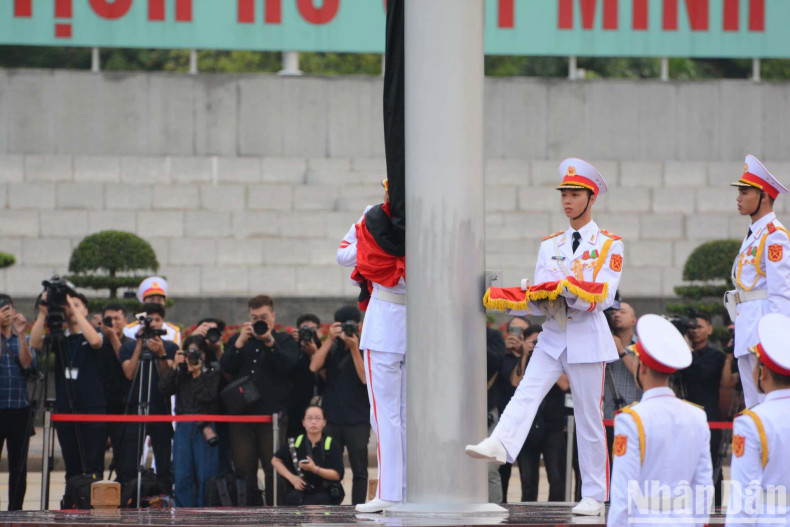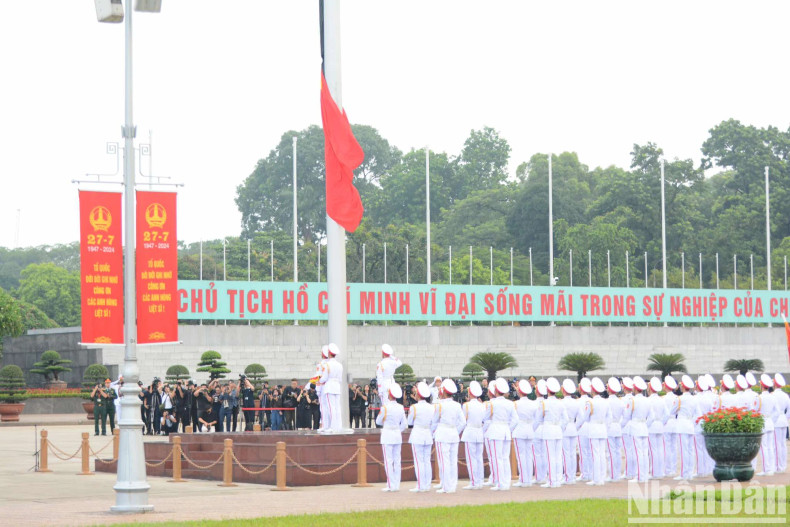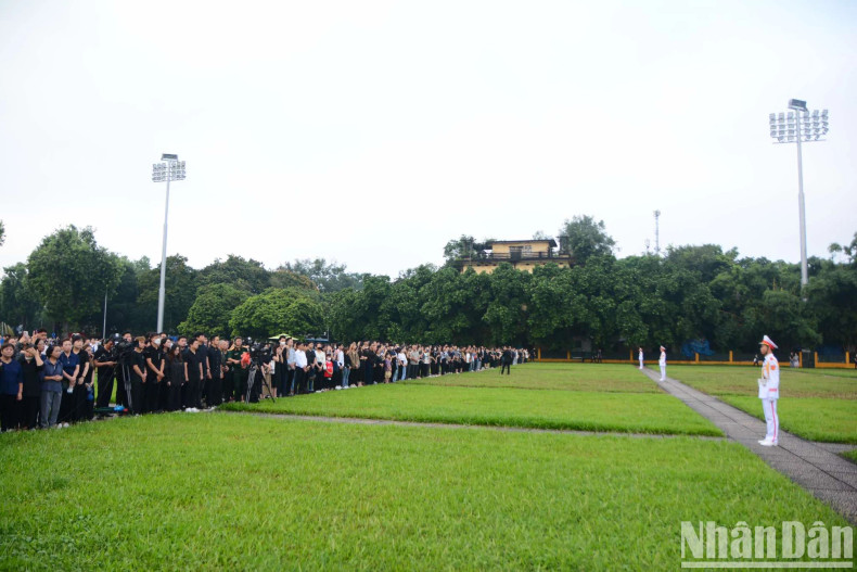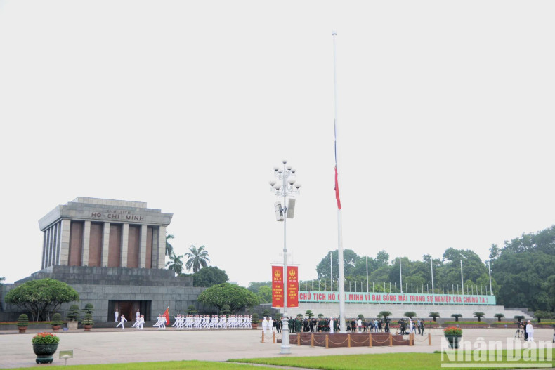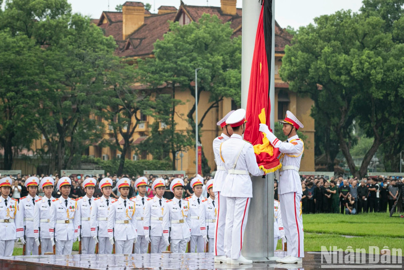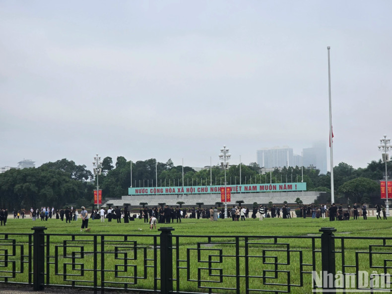 7月25日6时,在巴亭广场,越南共产党中央委员会总书记阮富仲国葬升旗仪式举行。数千名群众汇聚在胡志明主席陵,为阮富仲总书记表示哀悼。