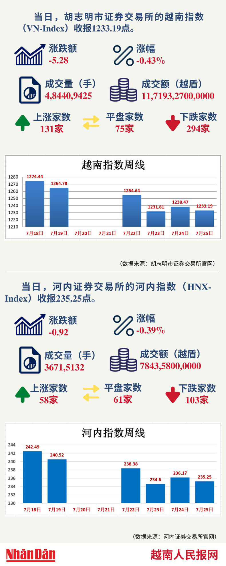 当天,胡志明市证券交易所的越南指数(VN-Index)和河内证券交易所的河内指数(HNX-Index)分别收报1233.19和235.25点。