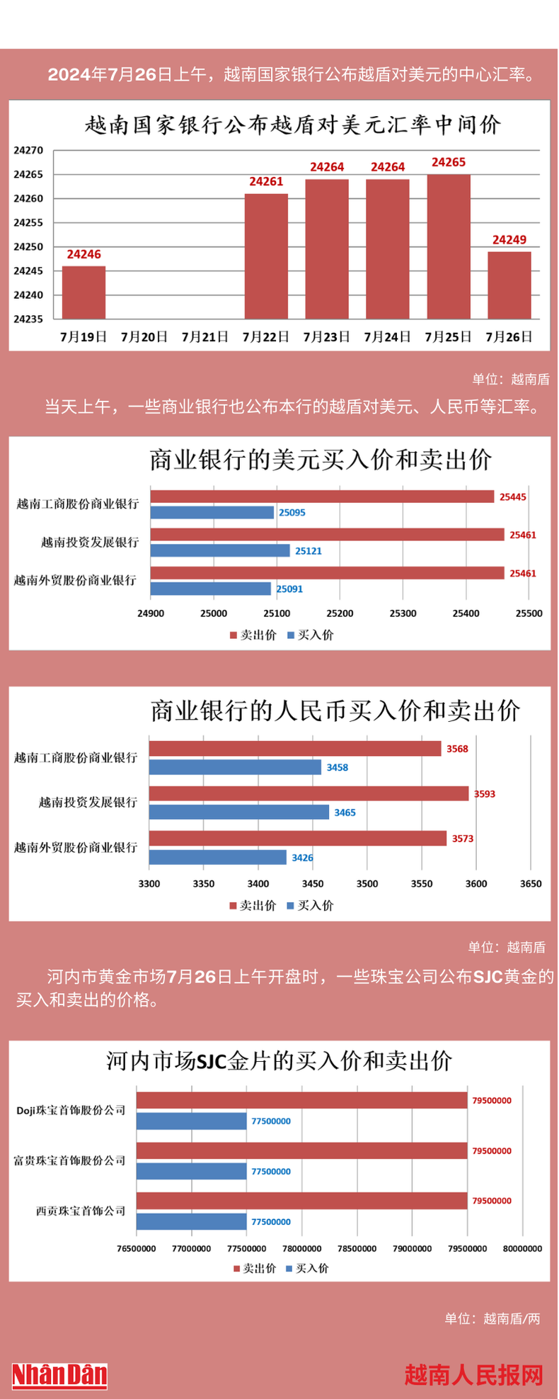 2024年7月26日上午,越南国家银行所公布的越盾对美元的中心汇率为24249。