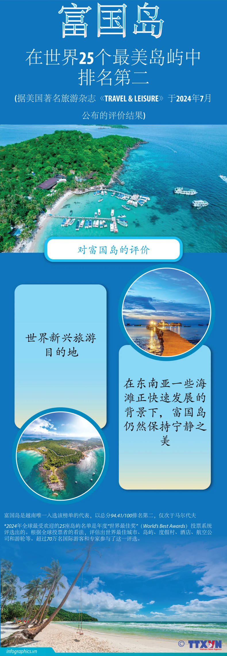美国著名旅游杂志《Travel & Leisure》于2024年7月公布了世界25个最美岛屿名单。越南富国岛是入选的唯一代表,排名第二,仅次于马尔代夫。