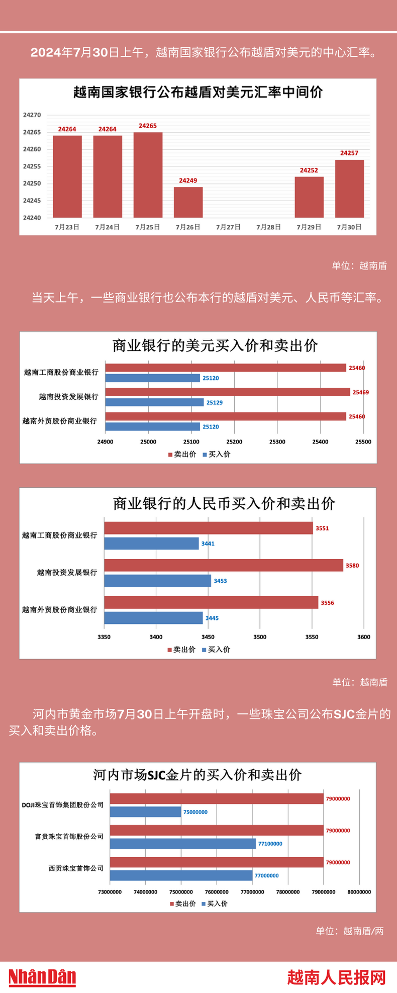 2024年7月30日上午,越南国家银行所公布的越盾对美元的中心汇率为24257。