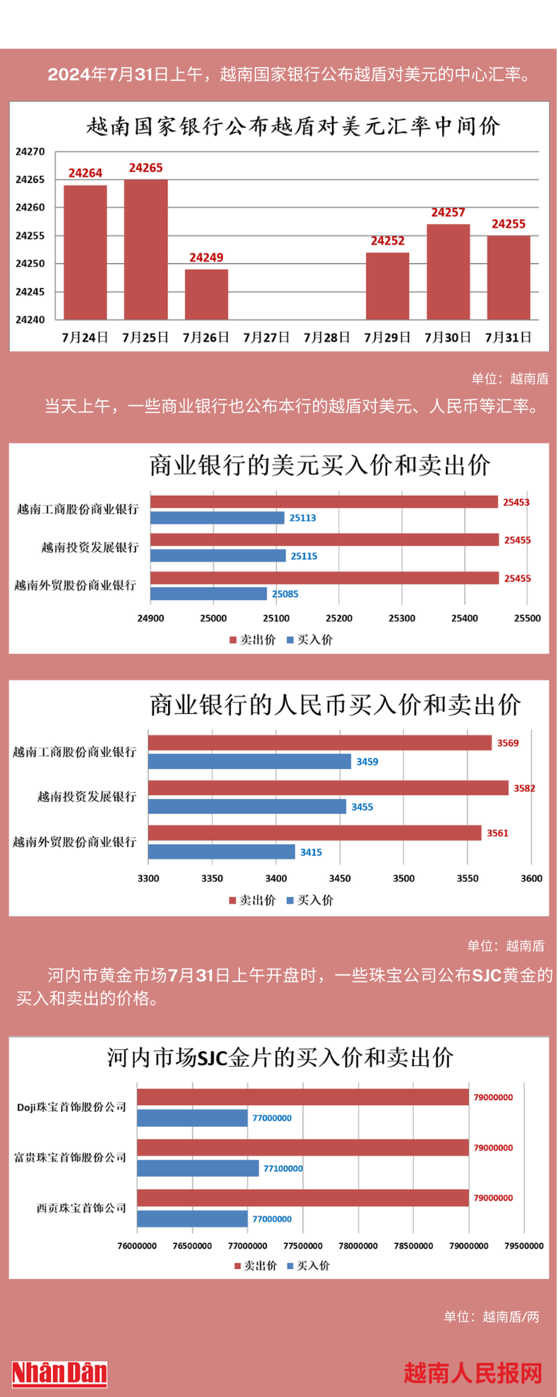 2024年7月31日上午,越南国家银行所公布的越盾对美元的中心汇率为24255。