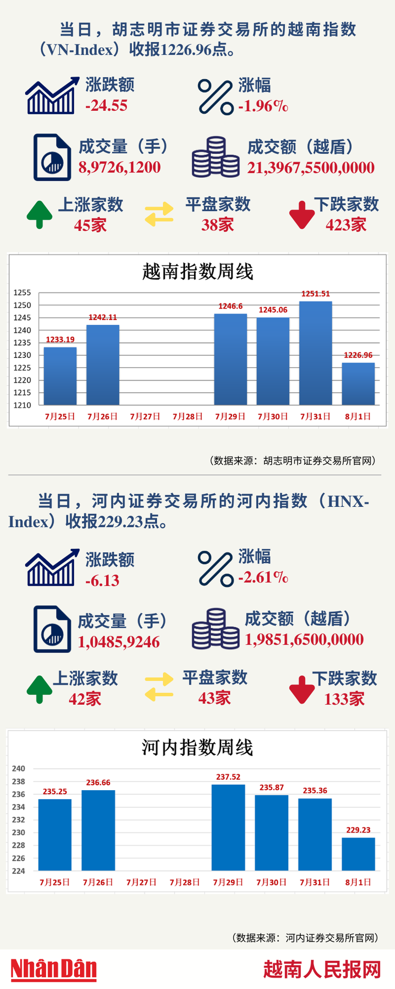 当天,胡志明市证券交易所的越南指数(VN-Index)和河内证券交易所的河内指数(HNX-Index)分别收报1226.96点和229.23点。