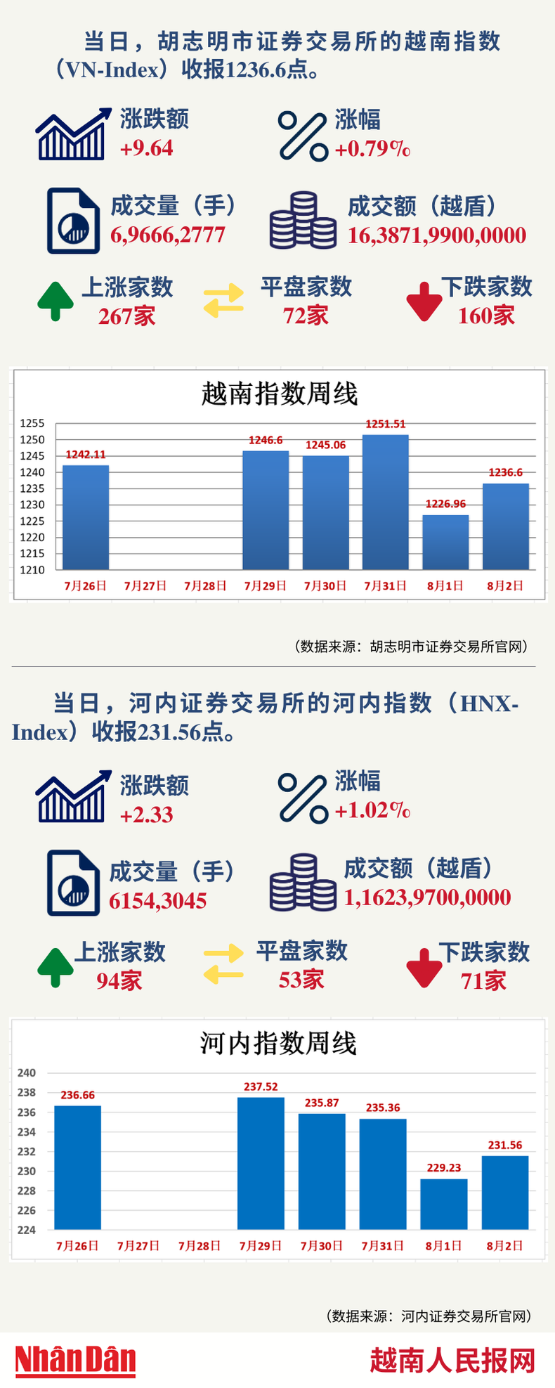 当天,胡志明市证券交易所的越南指数(VN-Index)和河内证券交易所的河内指数(HNX-Index)分别收报1236.6点和231.56点。