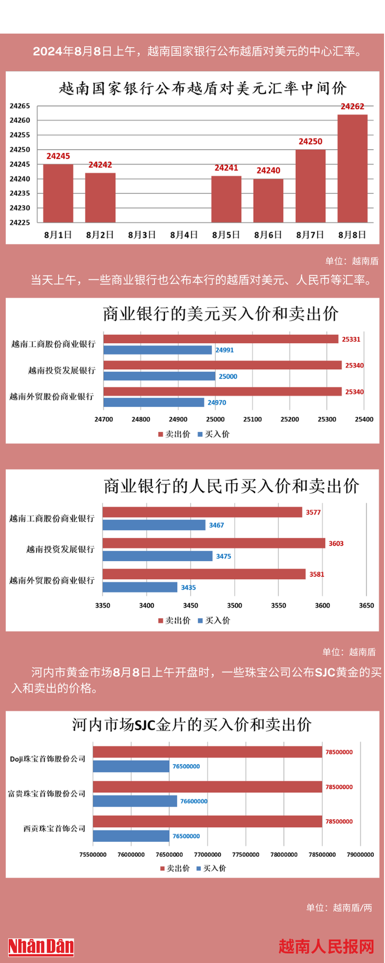 2024年8月8日上午,越南国家银行所公布的越盾对美元的中心汇率为24262。