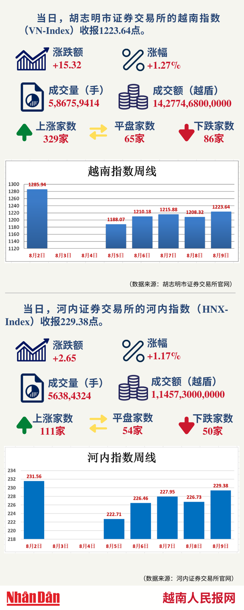 当天,胡志明市证券交易所的越南指数(VN-Index)和河内证券交易所的河内指数(HNX-Index)分别收报1223.64点和229.38点。