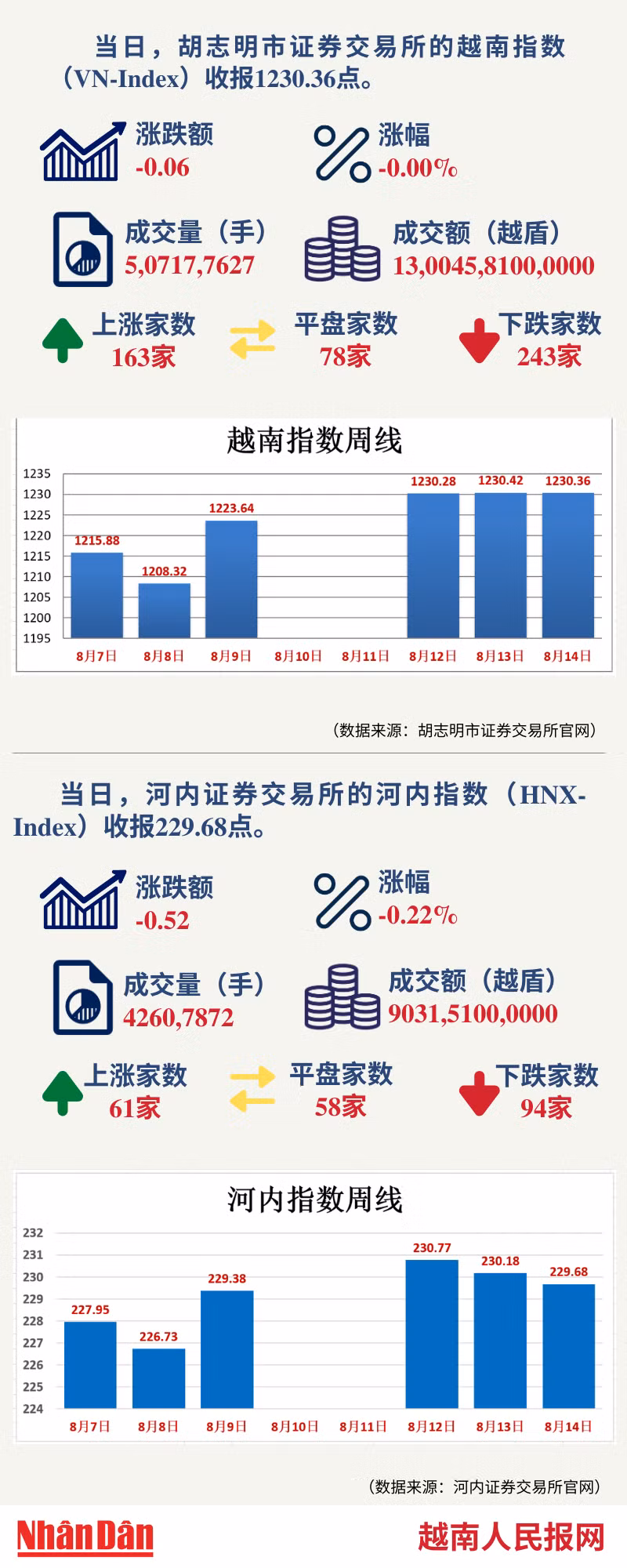 当天,胡志明市证券交易所的越南指数(VN-Index)和河内证券交易所的河内指数(HNX-Index)分别收报1230.36点和229.68点。