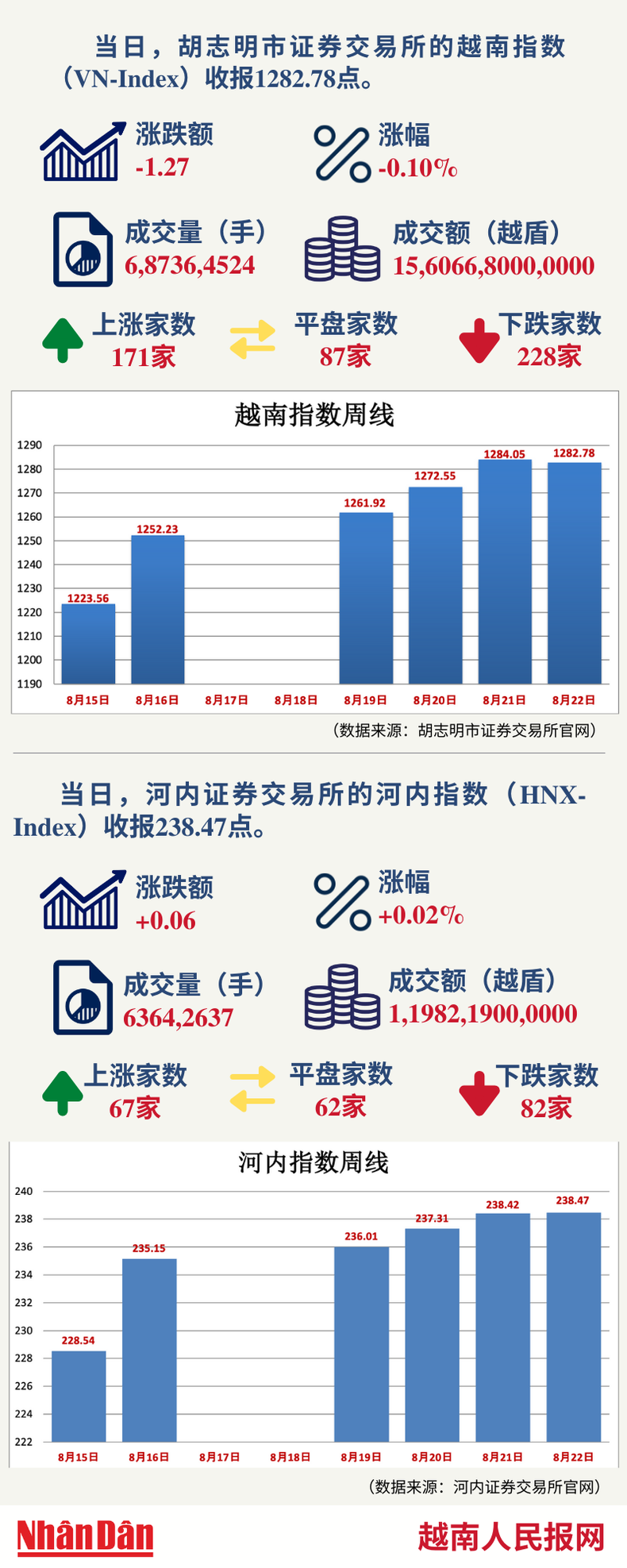 当天,胡志明市证券交易所的越南指数(VN-Index)和河内证券交易所的河内指数(HNX-Index)分别收报1282.78点和238.47点。