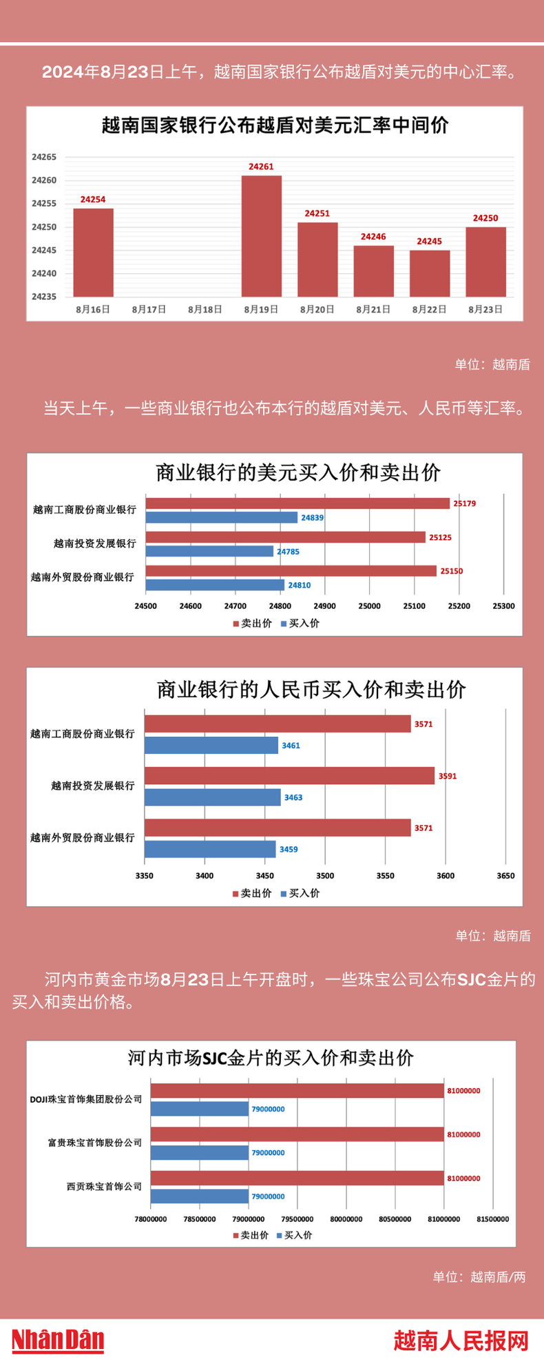 2024年8月23日上午,越南国家银行所公布的越盾对美元的中心汇率为24250。
