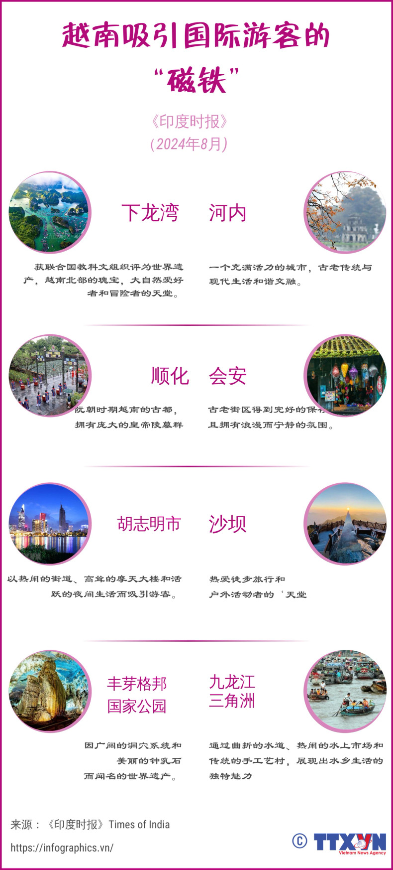 《印度时报》近日刊登了一篇文章,介绍了越南一系列著名的旅游胜地,将其誉为吸引游客的“磁铁”。文章指出,越南以其壮丽的自然风光、丰富的历史遗迹和多彩的文化底蕴,展现了令人心驰神往的独特魅力。