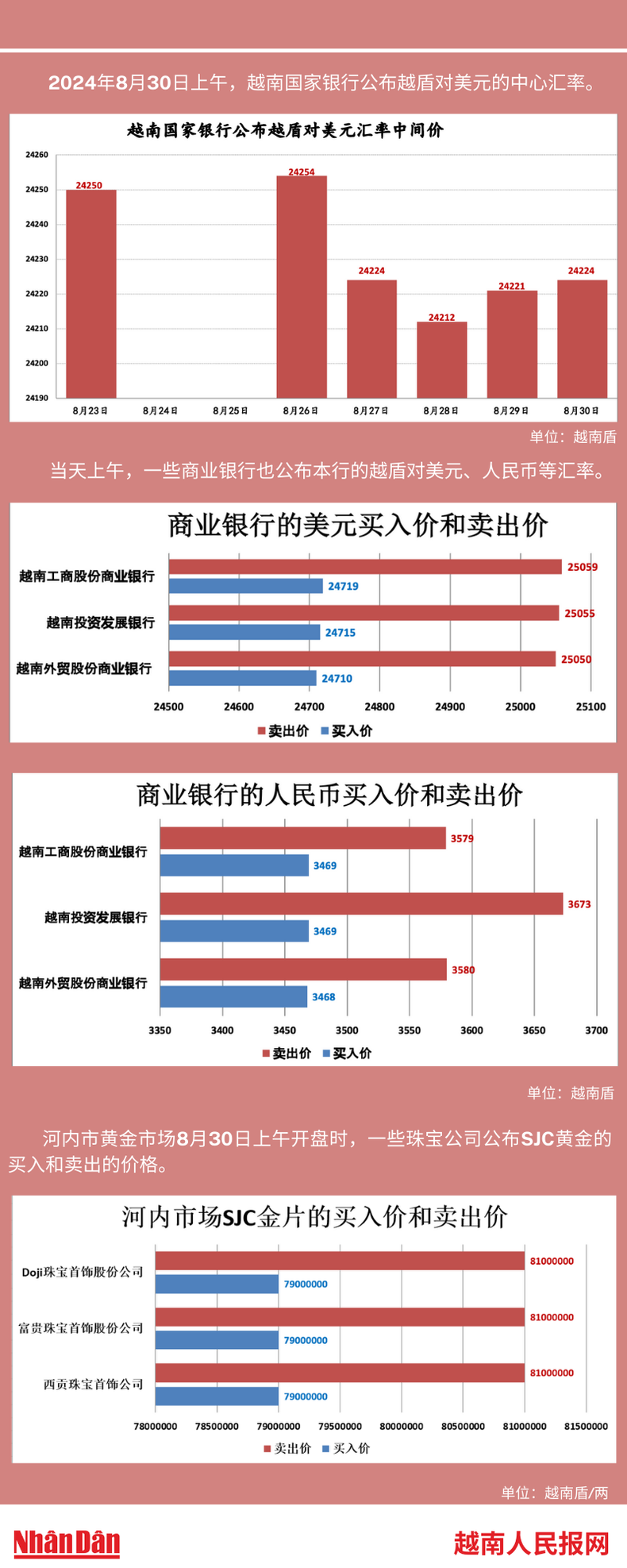 2024年8月30日上午,越南国家银行所公布的越盾对美元的中心汇率为24224。