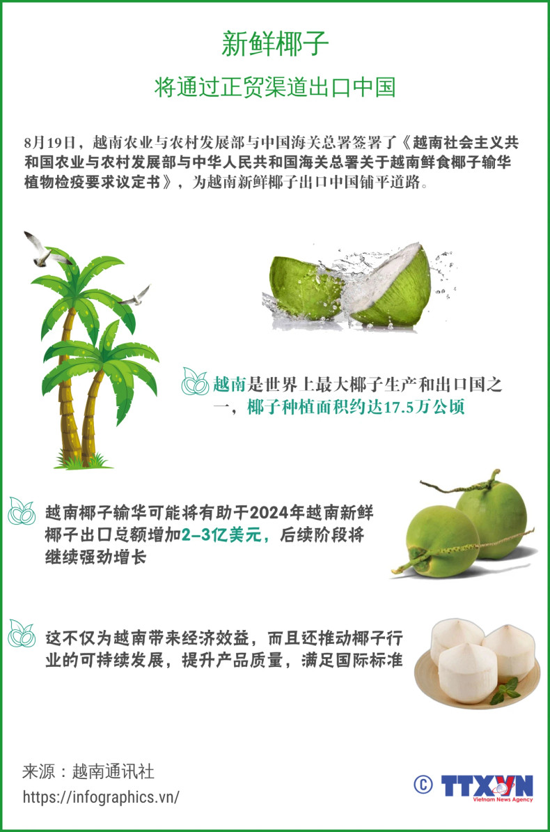 8月19日,越南农业与农村发展部与中国海关总署签署了《越南社会主义共和国农业与农村发展部与中华人民共和国海关总署关于越南鲜食椰子输华植物检疫要求议定书》,为越南新鲜椰子出口中国铺平道路。