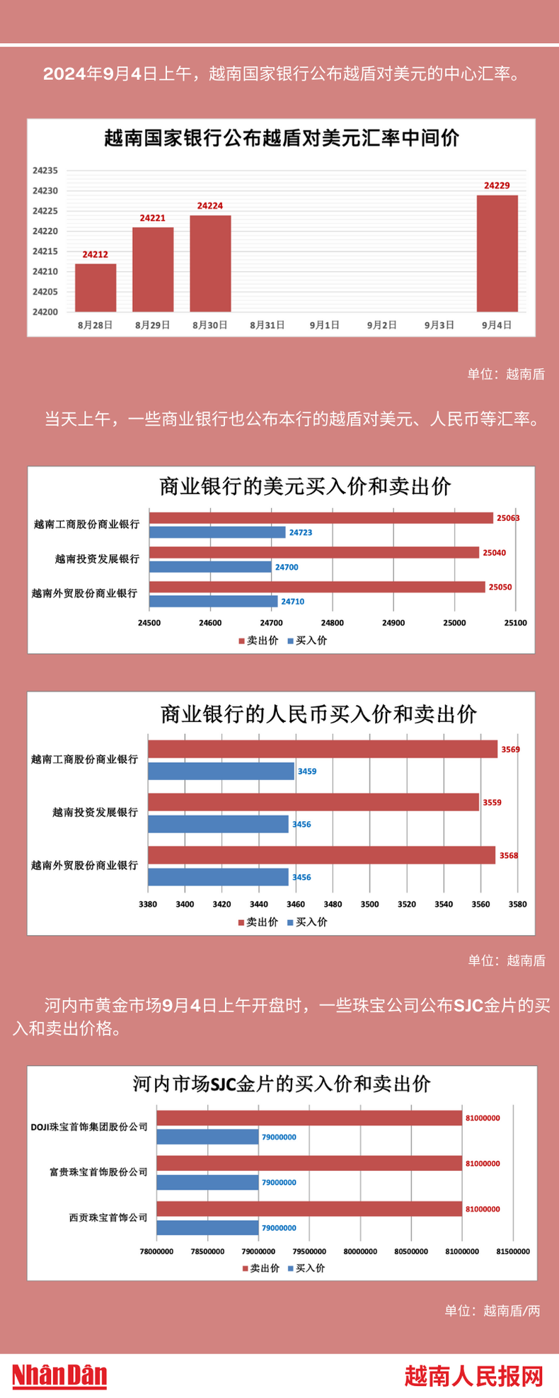 2024年9月4日上午,越南国家银行所公布的越盾对美元的中心汇率为24229。