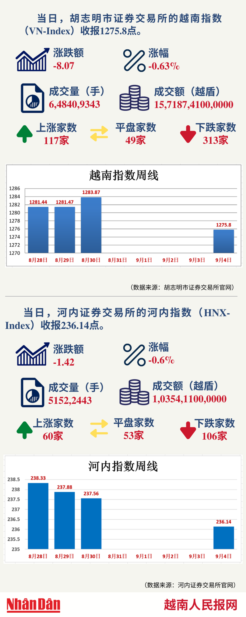 当天,胡志明市证券交易所的越南指数(VN-Index)和河内证券交易所的河内指数(HNX-Index)分别收报1275.8点和236.14点。