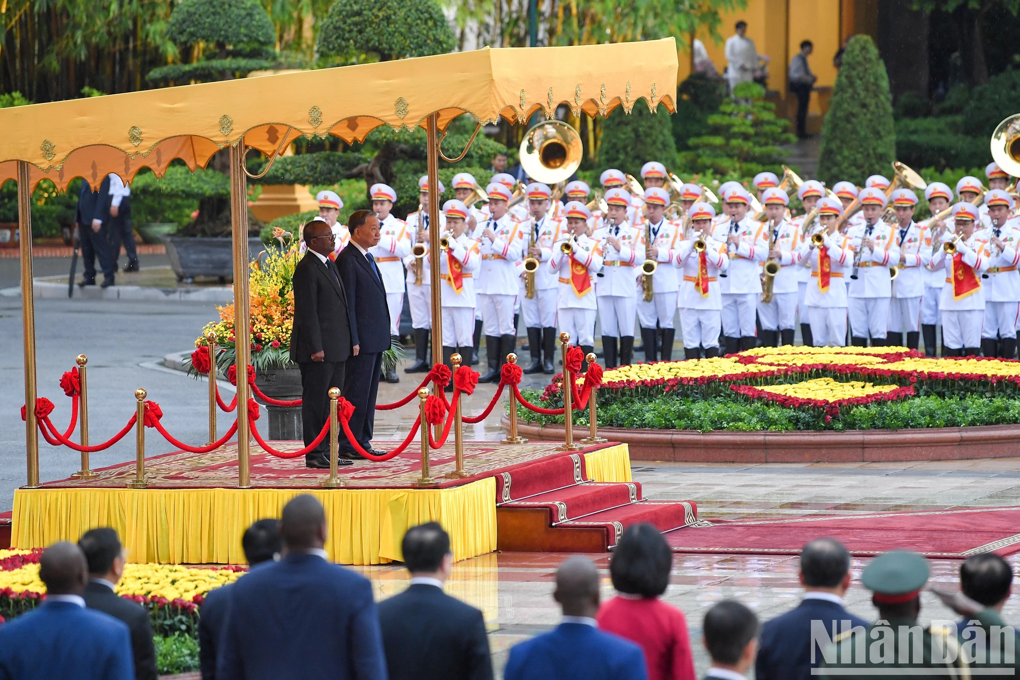 | 越共中央总书记、国家主席苏林与几内亚比绍共和国总统乌马罗·西索科·恩巴洛登上荣誉主席台,聆听军乐奏响两国国歌。 |