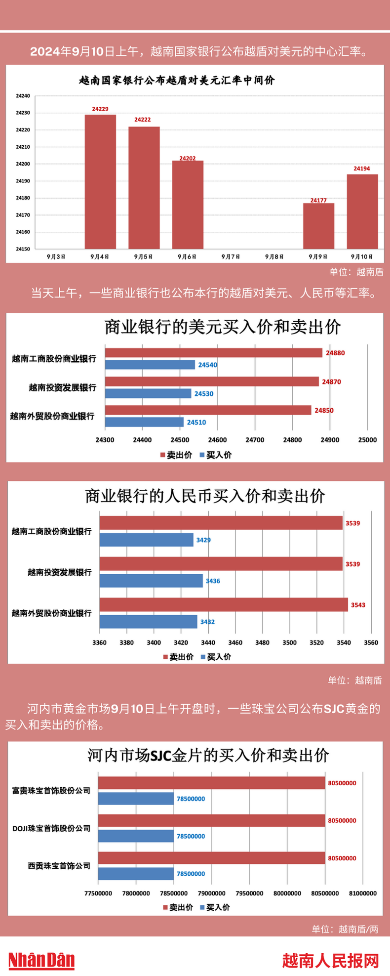2024年9月10日上午,越南国家银行所公布的越盾对美元的中心汇率为24194。