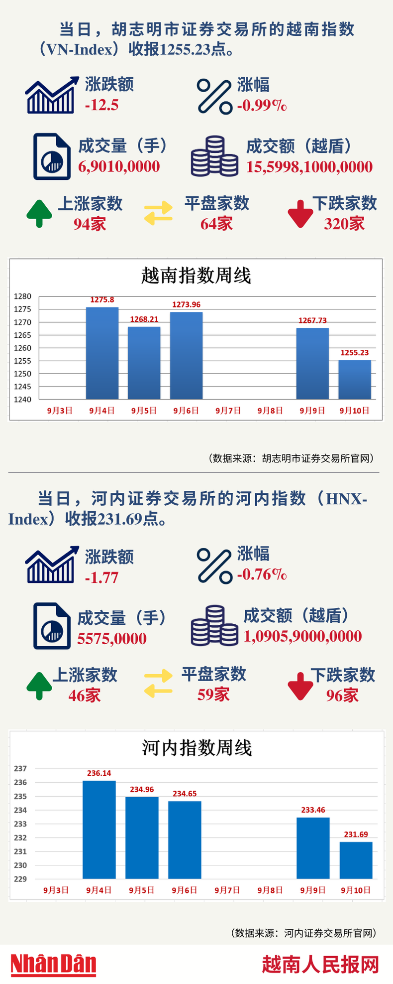 当天,胡志明市证券交易所的越南指数(VN-Index)和河内证券交易所的河内指数(HNX-Index)分别收报1255.23点和231.69点。