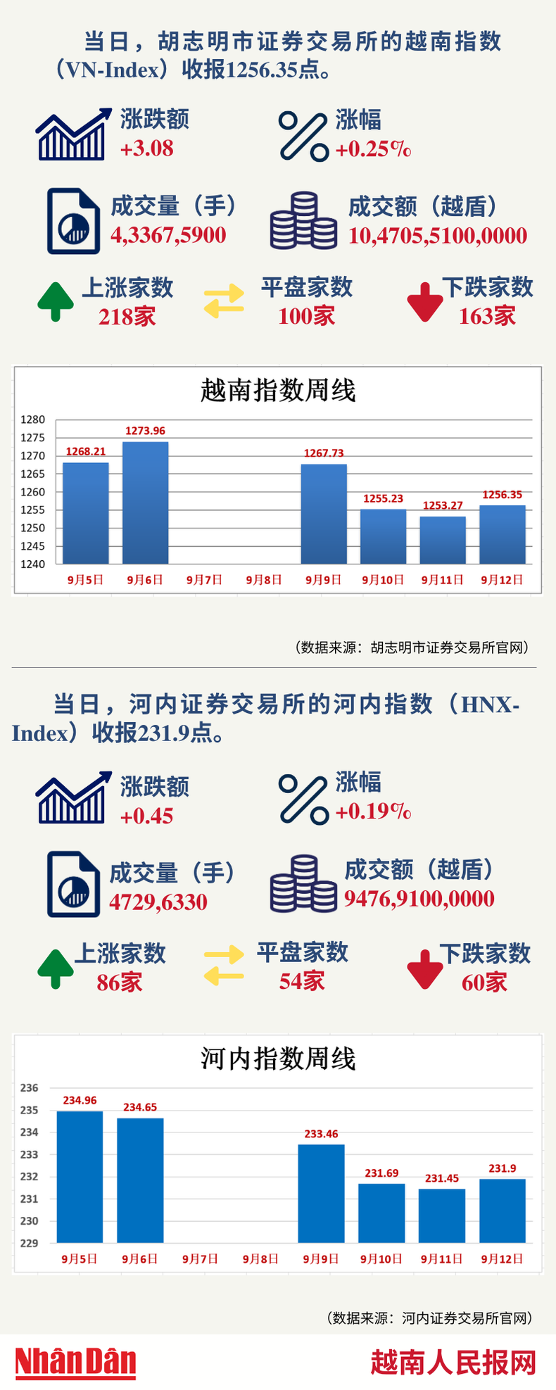 当天,胡志明市证券交易所的越南指数(VN-Index)和河内证券交易所的河内指数(HNX-Index)分别收报1256.35点和231.9点。