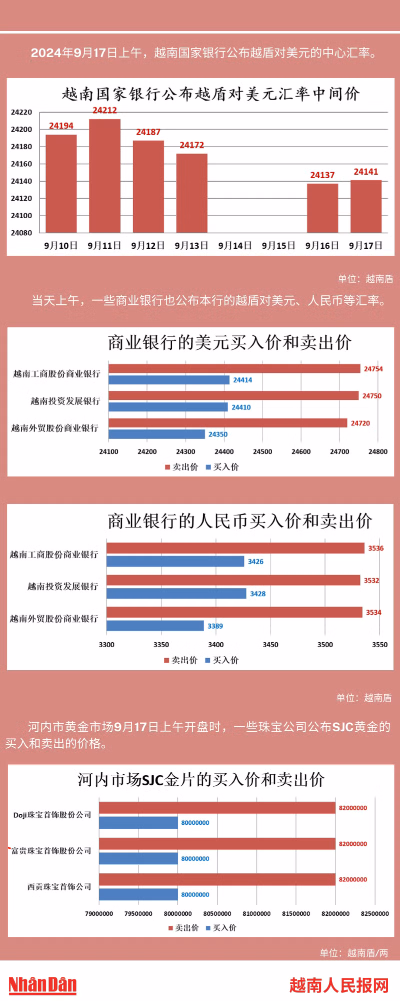 2024年9月17日上午,越南国家银行所公布的越盾对美元的中心汇率为24141。