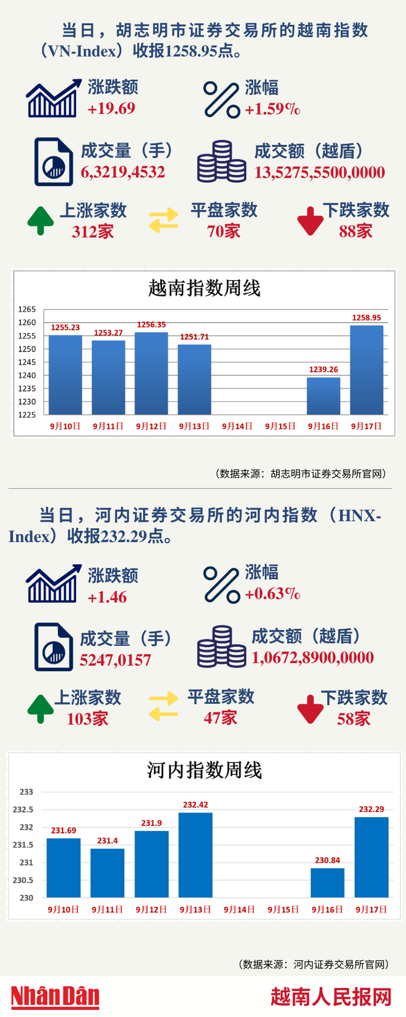 当天,胡志明市证券交易所的越南指数(VN-Index)和河内证券交易所的河内指数(HNX-Index)分别收报1258.95点和232.29点。