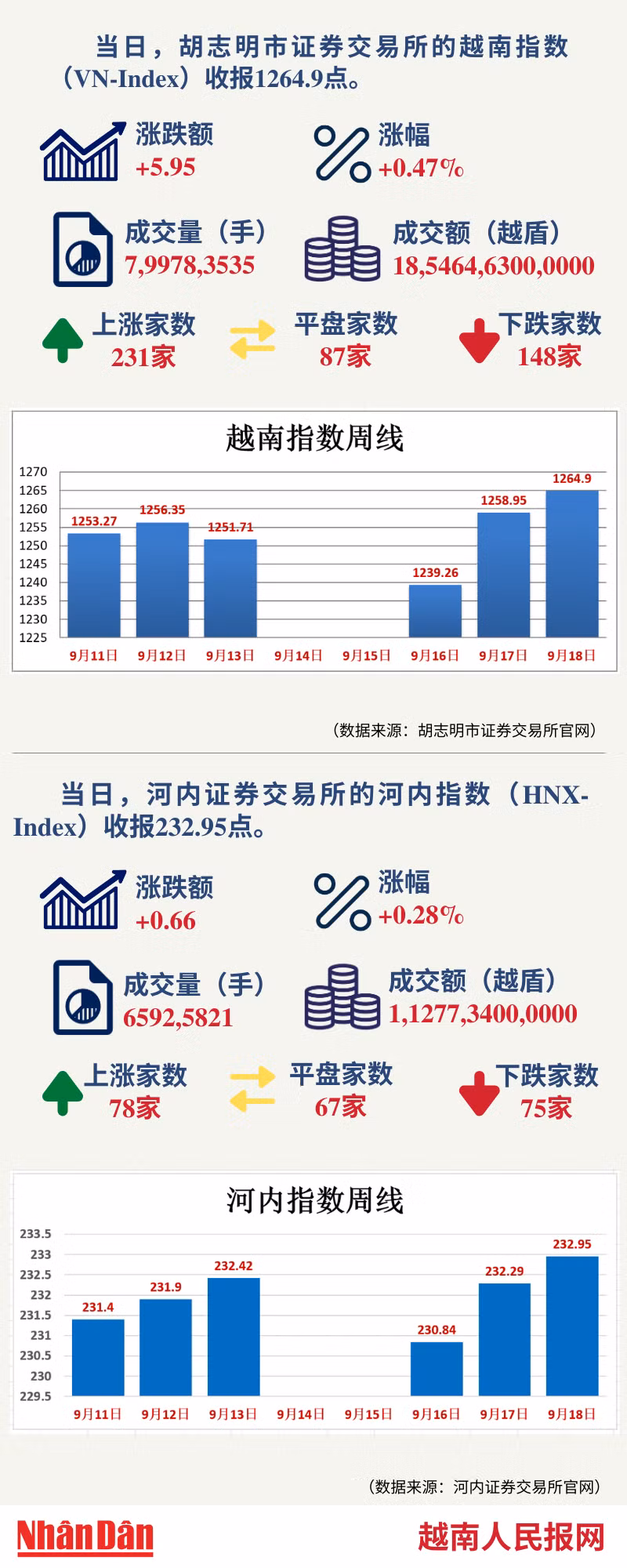 当天,胡志明市证券交易所的越南指数(VN-Index)和河内证券交易所的河内指数(HNX-Index)分别收报1264.9点和232.95点。