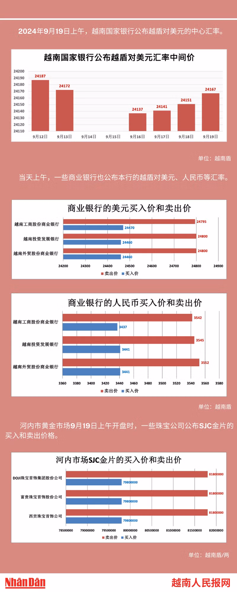 2024年9月19日上午,越南国家银行所公布的越盾对美元的中心汇率为24167。