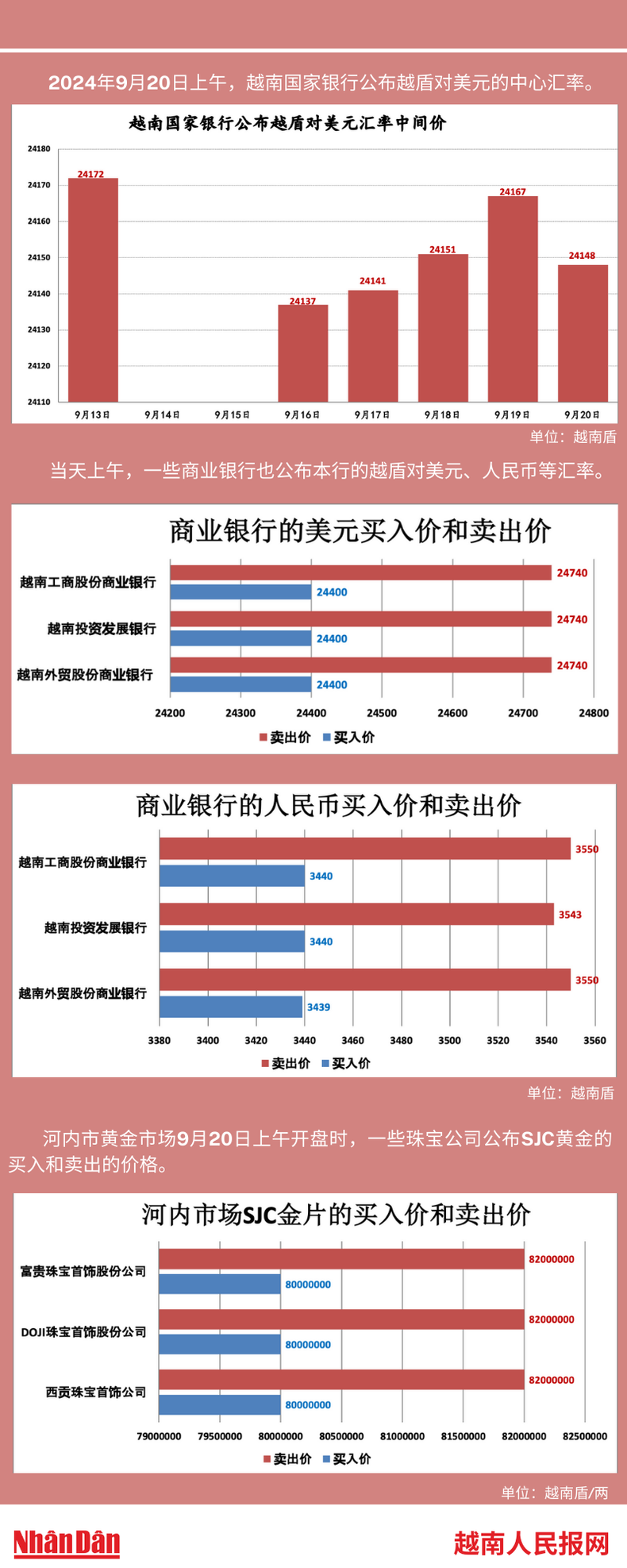 2024年9月20日上午,越南国家银行所公布的越盾对美元的中心汇率为24148。