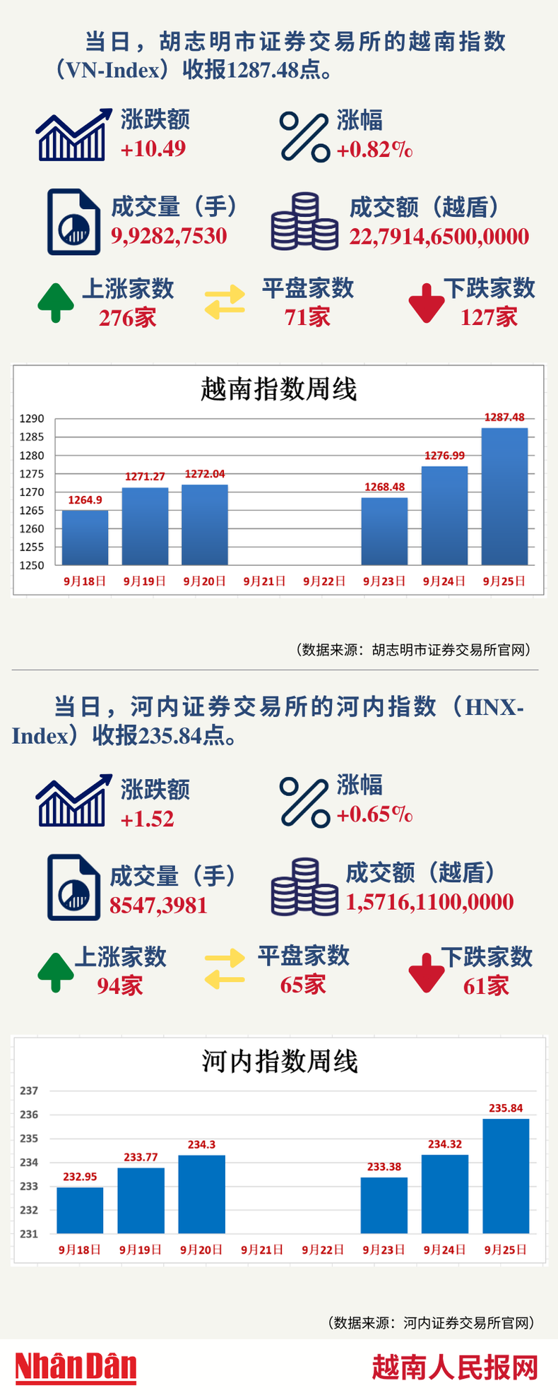 当天,胡志明市证券交易所的越南指数(VN-Index)和河内证券交易所的河内指数(HNX-Index)分别收报1287.48点和235.84点。