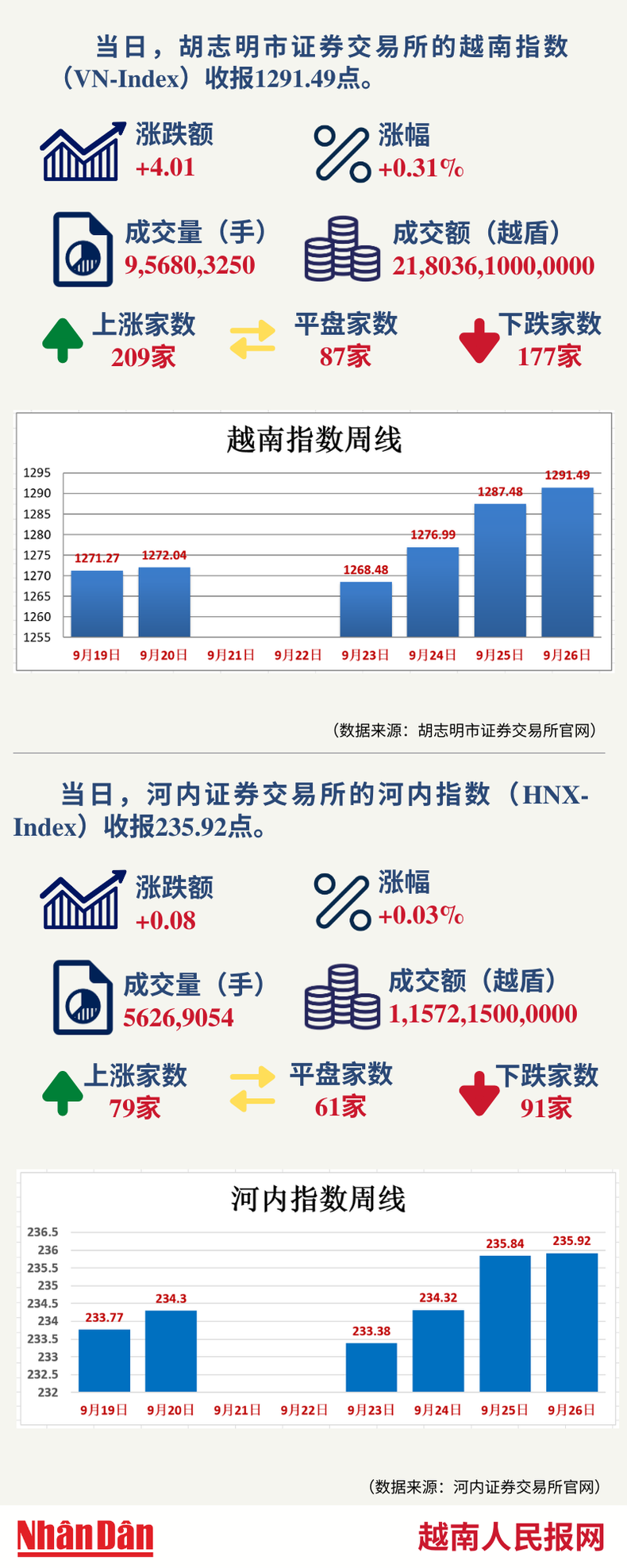 当天,胡志明市证券交易所的越南指数(VN-Index)和河内证券交易所的河内指数(HNX-Index)分别收报1291.49点和235.92点。