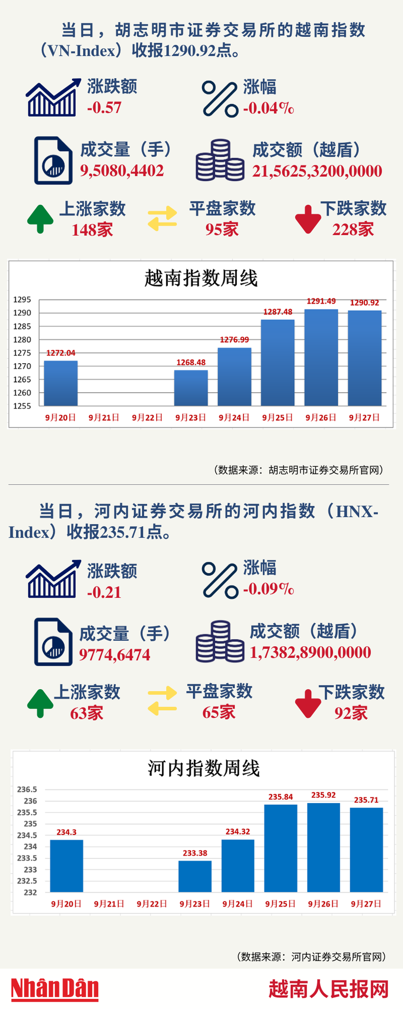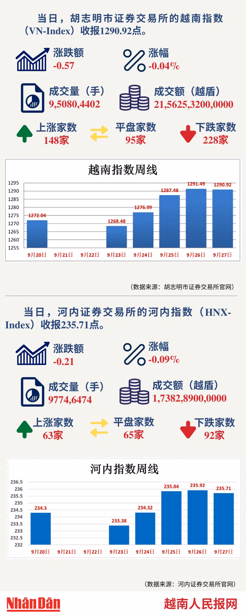 当天,胡志明市证券交易所的越南指数(VN-Index)和河内证券交易所的河内指数(HNX-Index)分别收报1290.92点和235.71点。