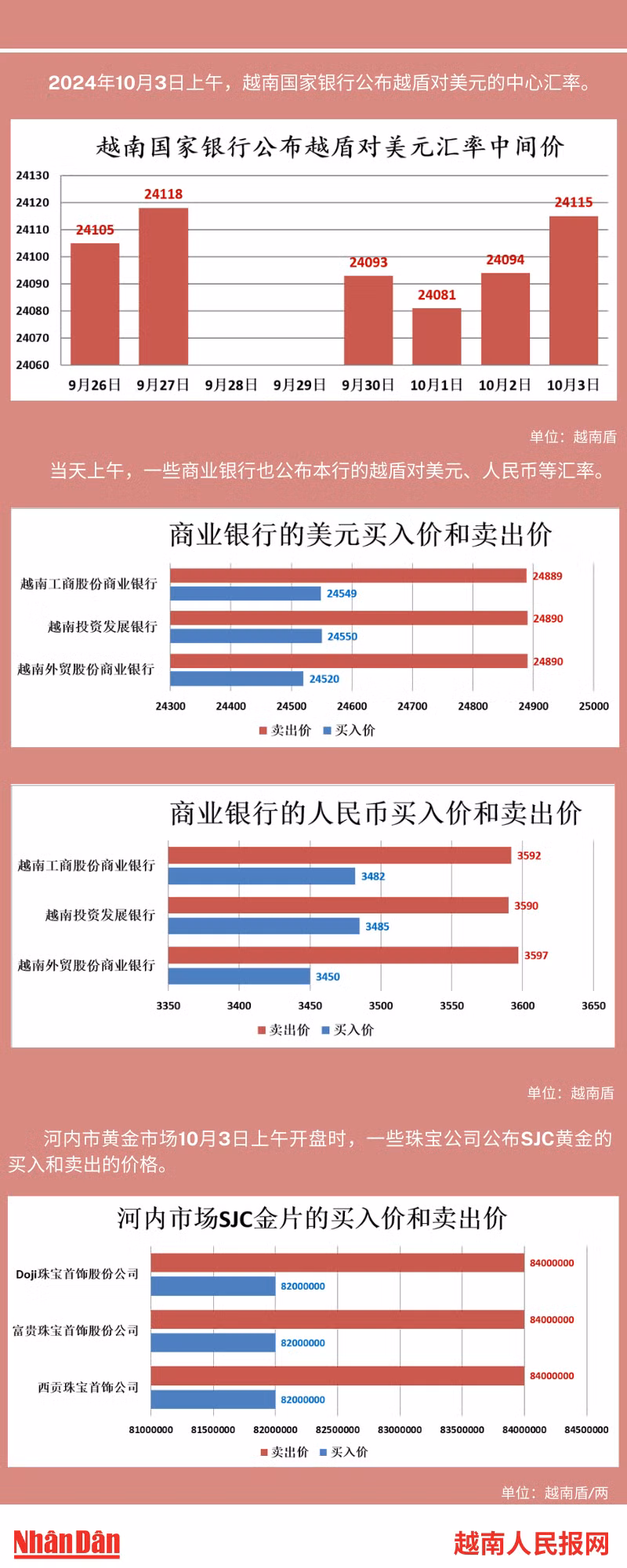 2024年10月3日上午,越南国家银行所公布的越盾对美元的中心汇率为24115。