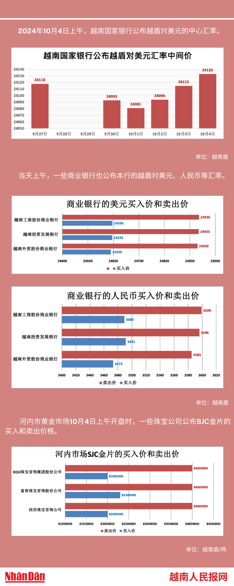 2024年10月4日上午,越南国家银行所公布的越盾对美元的中心汇率为24133。