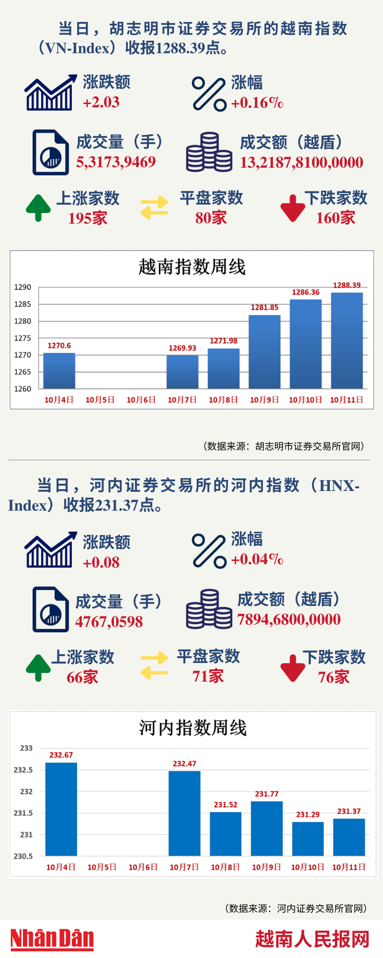 当天,胡志明市证券交易所的越南指数(VN-Index)和河内证券交易所的河内指数(HNX-Index)分别收报1288.39点和231.37点。