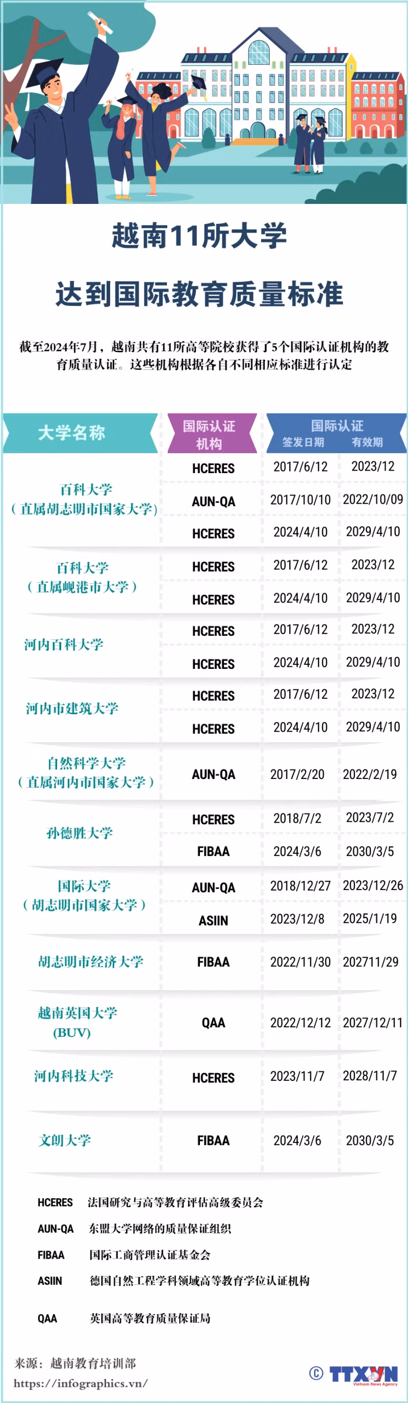 截止2024年7月,越南共有11所高等院校获得了5个国际认证机构的教育质量认证。这些组织根据各自不同相应标准进行认定。