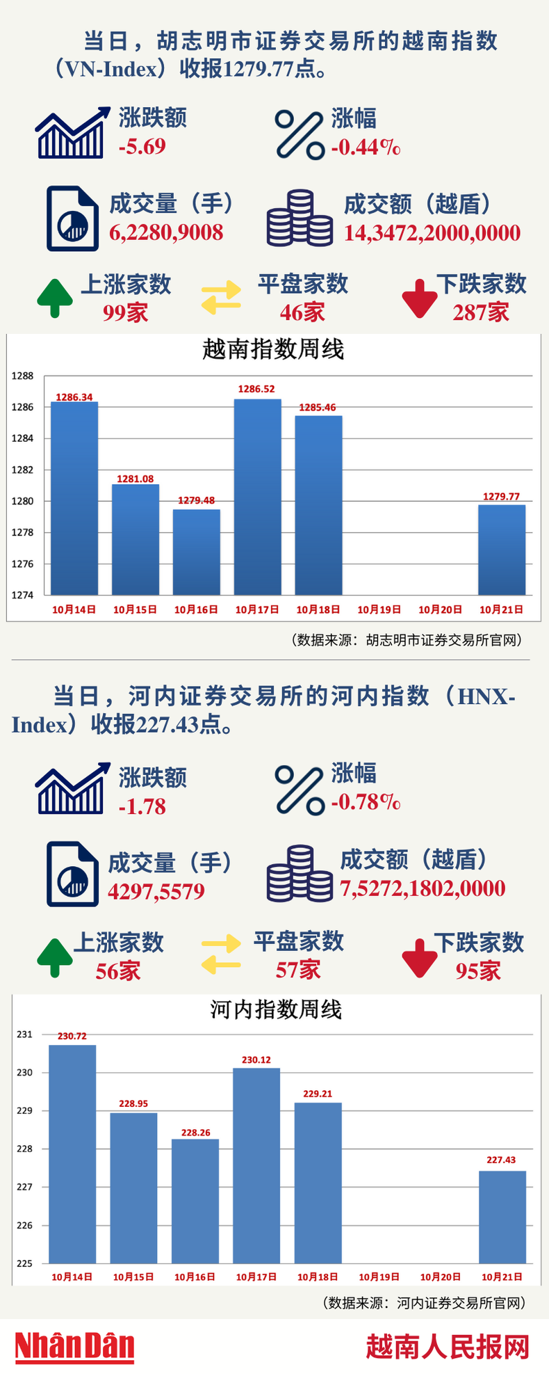 当天,胡志明市证券交易所的越南指数(VN-Index)和河内证券交易所的河内指数(HNX-Index)分别收报1279.77点和227.43点。
