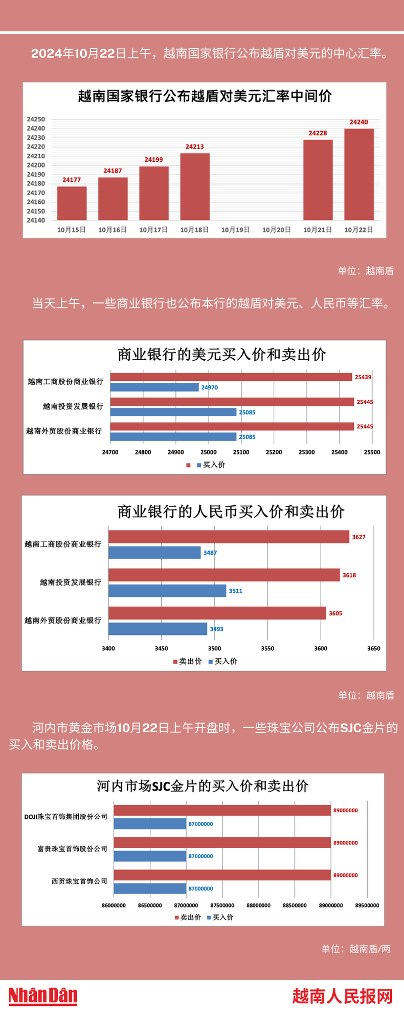 2024年10月22日上午,越南国家银行所公布的越盾对美元的中心汇率为24240。