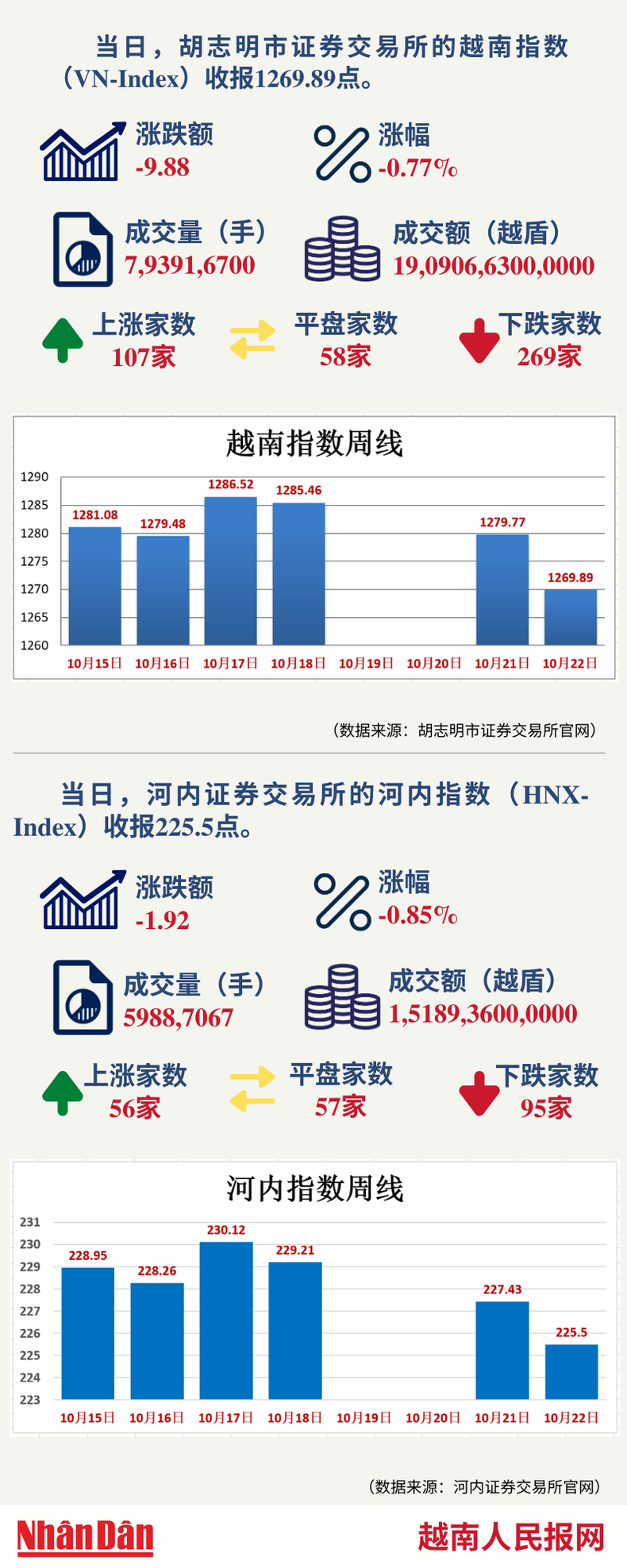 当天,胡志明市证券交易所的越南指数(VN-Index)和河内证券交易所的河内指数(HNX-Index)分别收报1269.89点和225.5点。