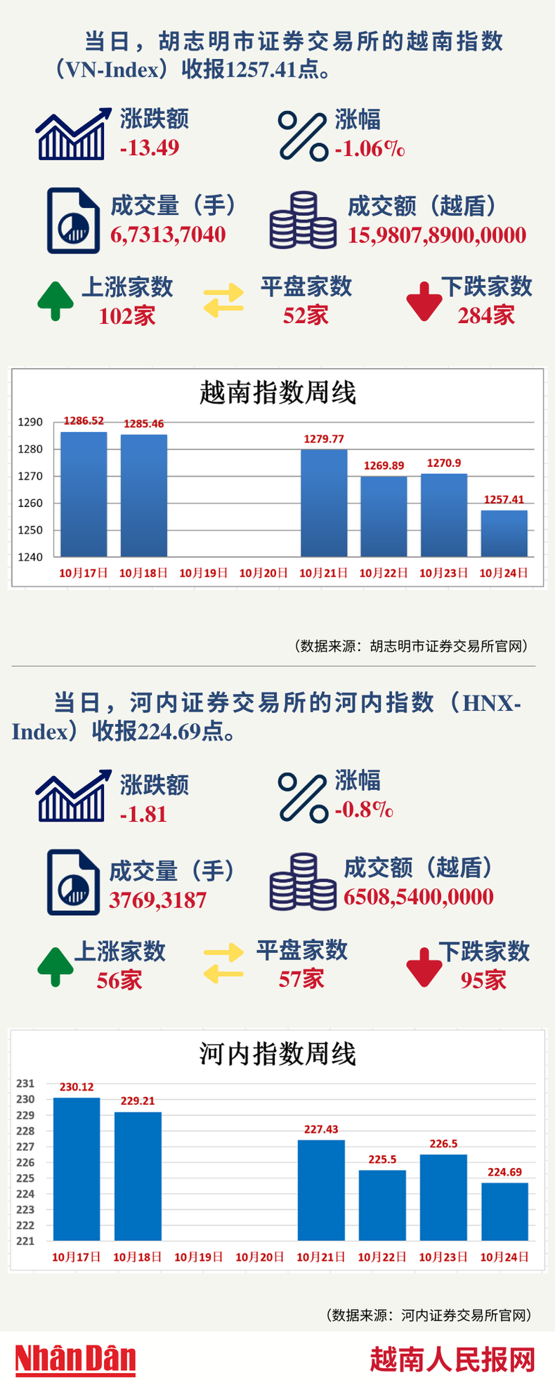 当天,胡志明市证券交易所的越南指数(VN-Index)和河内证券交易所的河内指数(HNX-Index)分别收报1257.41点和224.69点。