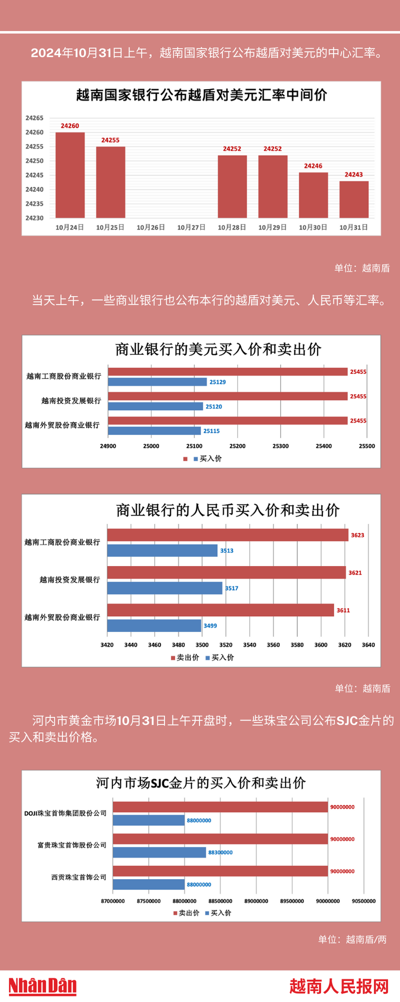 2024年10月31日上午,越南国家银行所公布的越盾对美元的中心汇率为24243。