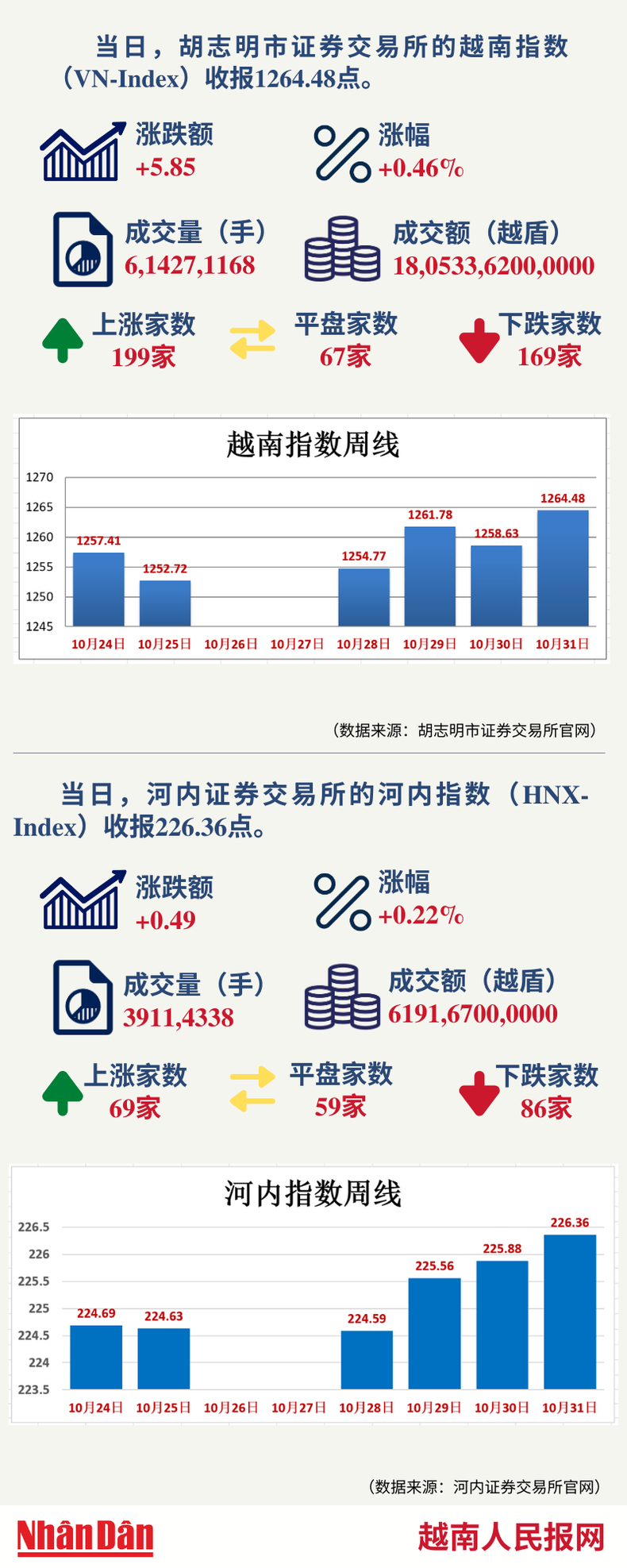 当天,胡志明市证券交易所的越南指数(VN-Index)和河内证券交易所的河内指数(HNX-Index)分别收报1264.48点和226.36点。