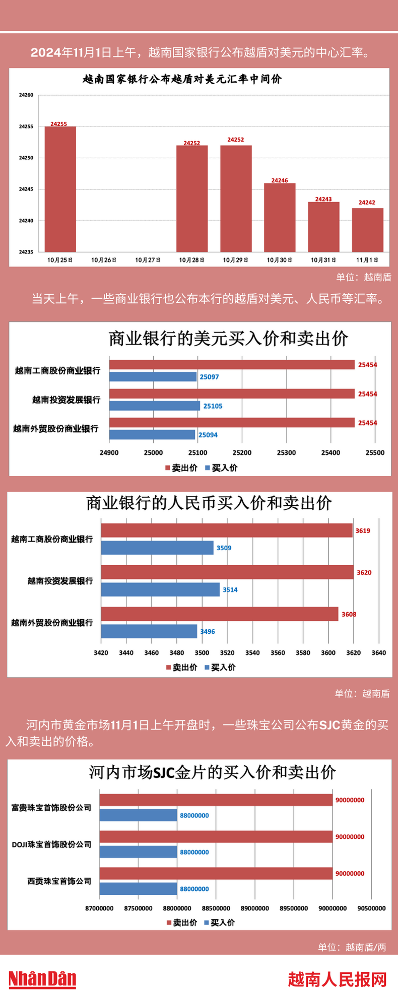 2024年11月1日上午,越南国家银行所公布的越盾对美元的中心汇率为24242。