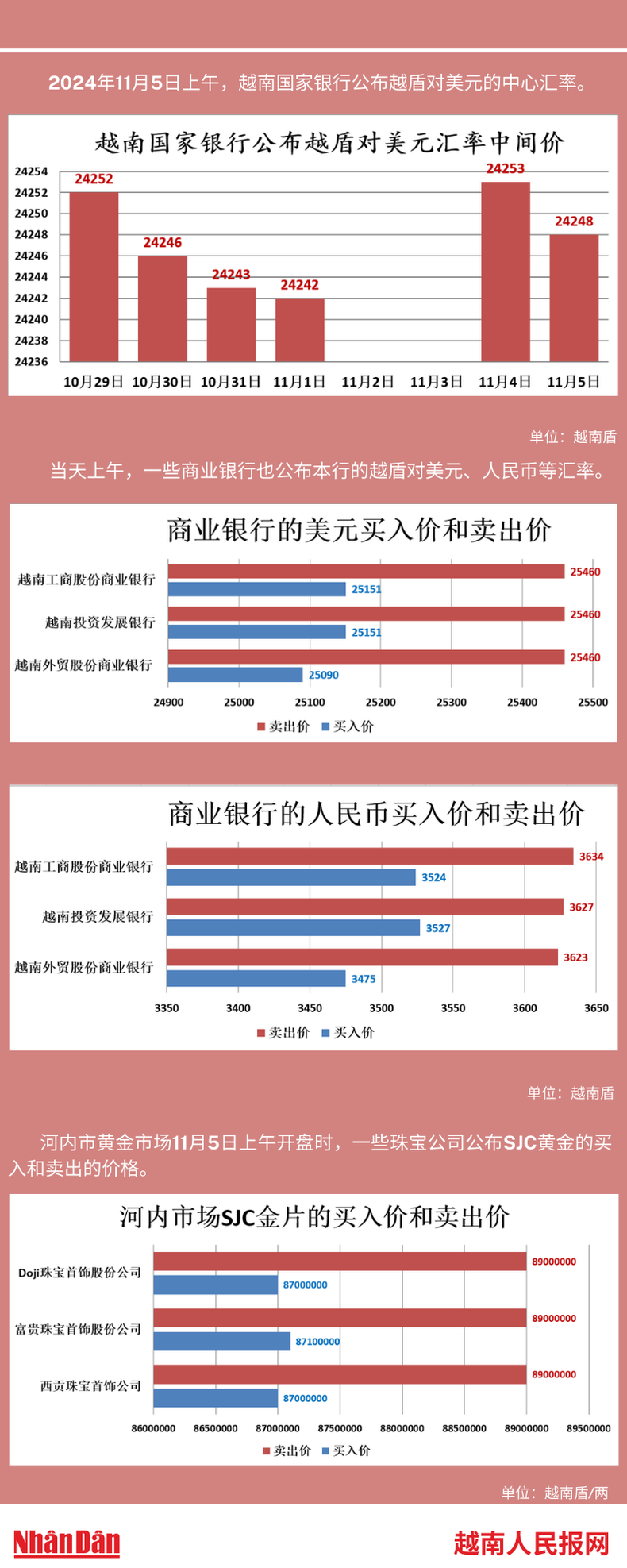 2024年11月5日上午,越南国家银行所公布的越盾对美元的中心汇率为24248。
