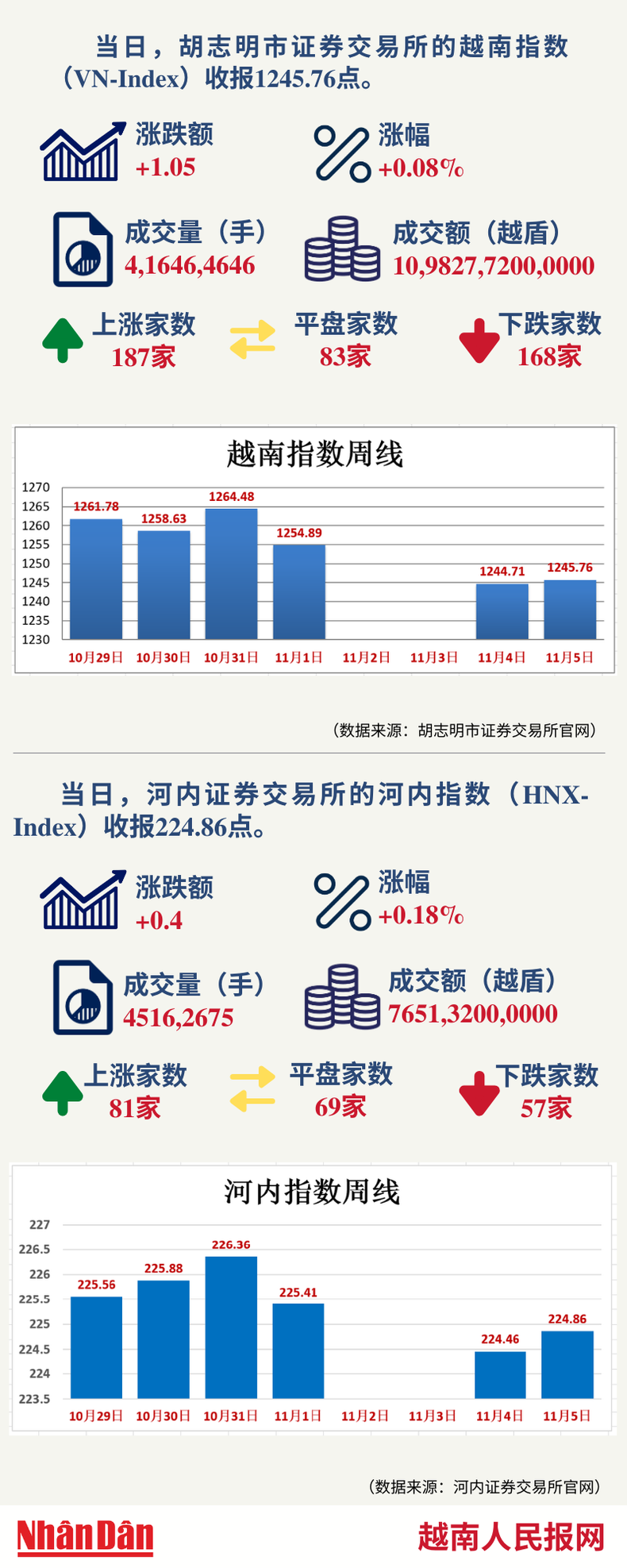 当天,胡志明市证券交易所的越南指数(VN-Index)和河内证券交易所的河内指数(HNX-Index)分别收报1245.76点和224.86点。