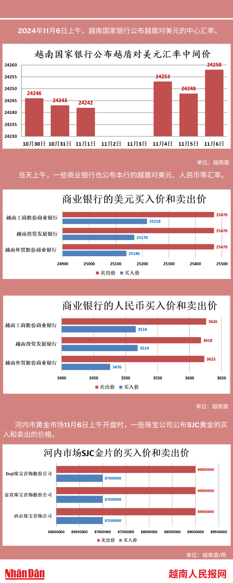 2024年11月6日上午,越南国家银行所公布的越盾对美元的中心汇率为24258。