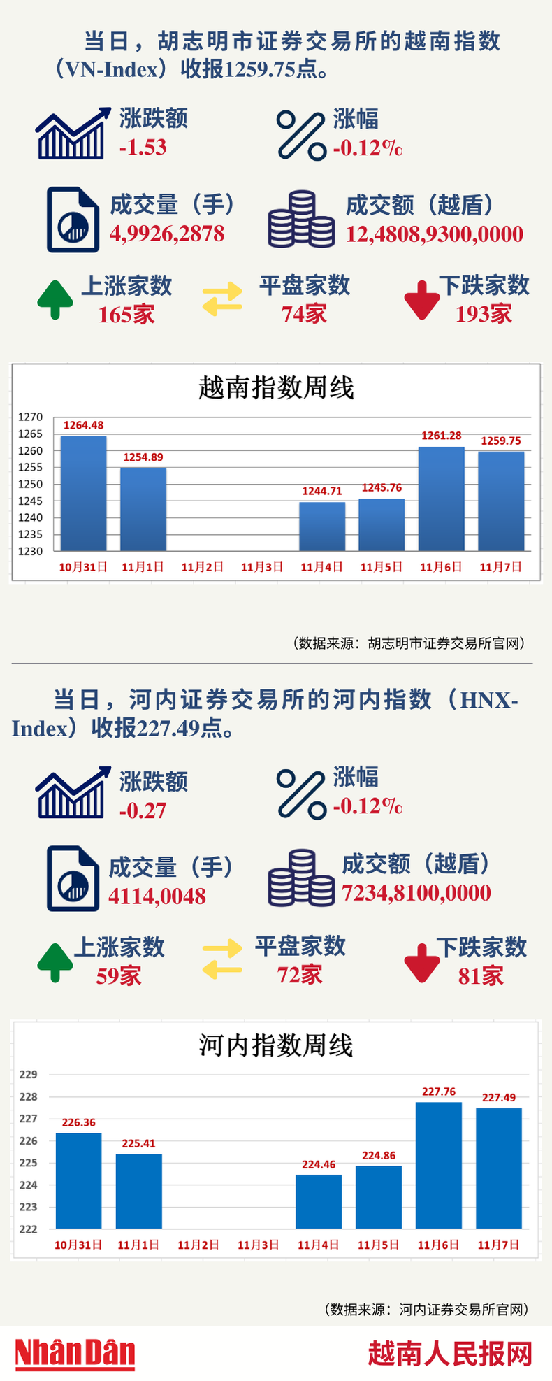 当天,胡志明市证券交易所的越南指数(VN-Index)和河内证券交易所的河内指数(HNX-Index)分别收报1259.75点和227.49点。