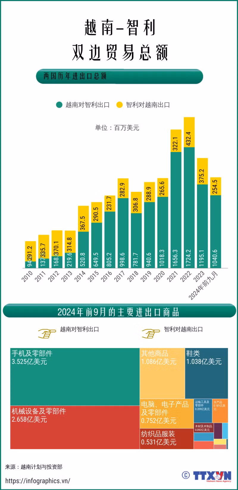 智利是于1971年3月25日与越南建立外交关系的首个南美国家。截至目前,越南与智利贸易关系发展令人印象深刻并取得积极成果。特别,越智自贸协定获批并于2014年正式生效已助推双边贸易额增长和进出口货物范围扩大。因此,越南国家主席梁强此次率团对智利进行的正式访问被期望将为两国贸易关系带来许多新机遇。