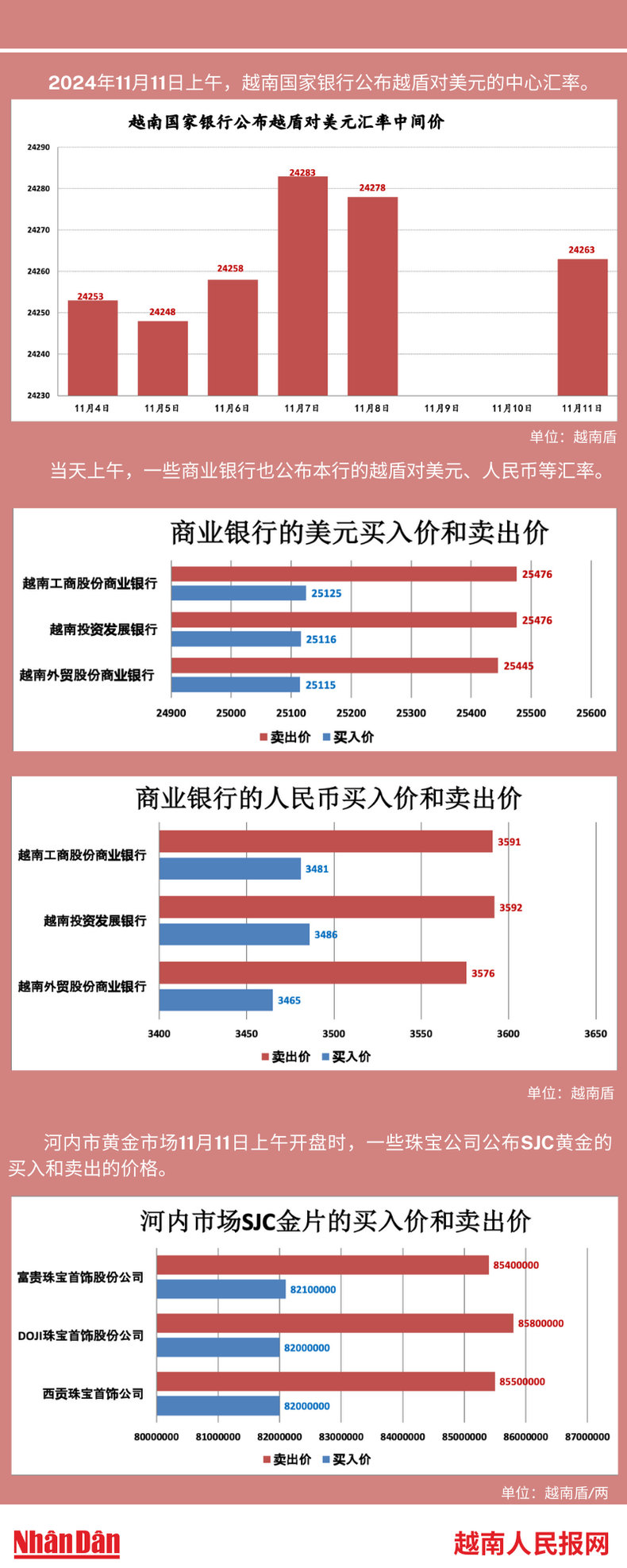 2024年11月11日上午,越南国家银行所公布的越盾对美元的中心汇率为24263。