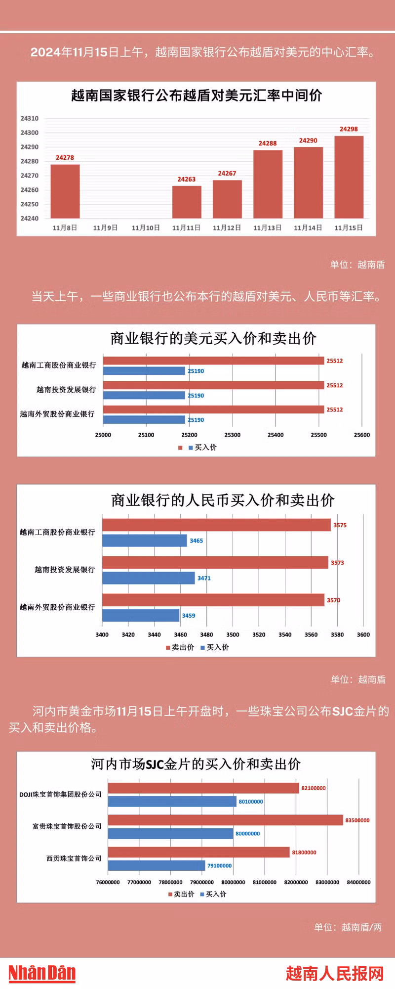 2024年11月15日上午,越南国家银行所公布的越盾对美元的中心汇率为24298。